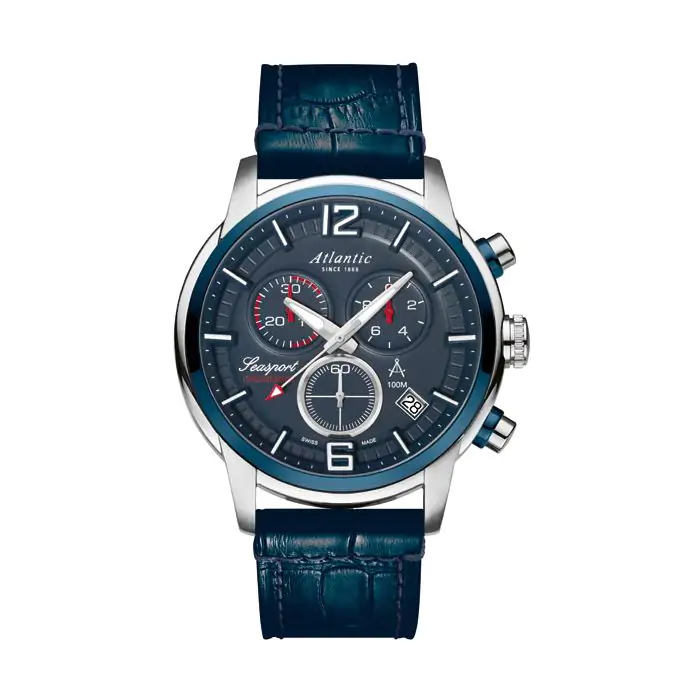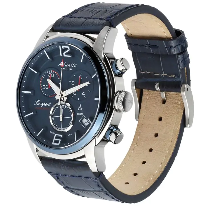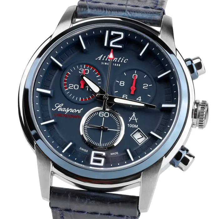 Zegarek męski Atlantic Seasport 87461.47.55 to nowy powiew świeżości w ofercie tego producenta. Zegarek prezentuje wysoką jakość wykonania i prestiż w połączeniu ze stylem Smart Casual. Koperta o średnicy 46 mm została wykonana z wysokiej jakości stali szlachetnej, która nie ulega korozji. Ciekawy cyferblat w kolorze granatowym chroniony jest przez szkło szafirowe, które jest odporne na zarysowania, co zapewnia estetyczny wygląd przez cały okres użytkowania. Przyciągające uwagę trójwymiarowe indeksy posiadają warstwę fluorescencyjną podobnie jak wskazówki. Dzięki temu odczytanie godziny w ciemności nie stanowi problemu. Granatowy skórzany pasek doskonale komponuje się z cyferblatem. Wskazanie czasu zapewnia dokładny szwajcarski mechanizm ETA. Jego dodatkowe funkcje to 30 minutowy stoper, który mierzy czas z dokładnością do 1/10s oraz datownik wskazujący aktualny dzień miesiąca. Wodoszczelność klasy 100m umożliwia swobodny kontakt z wodą np. podczas pływania.