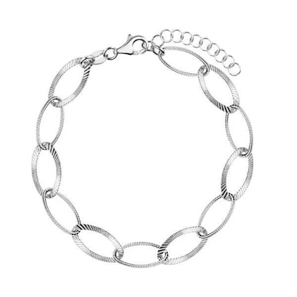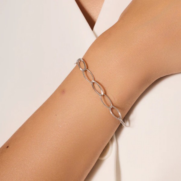 Bransoletka srebrna w wykończeniu rodowanym. Model posiada duże, owalne oczka. Biżuteria świetnie sprawdzi się jako dodatek do codziennej stylizacji.