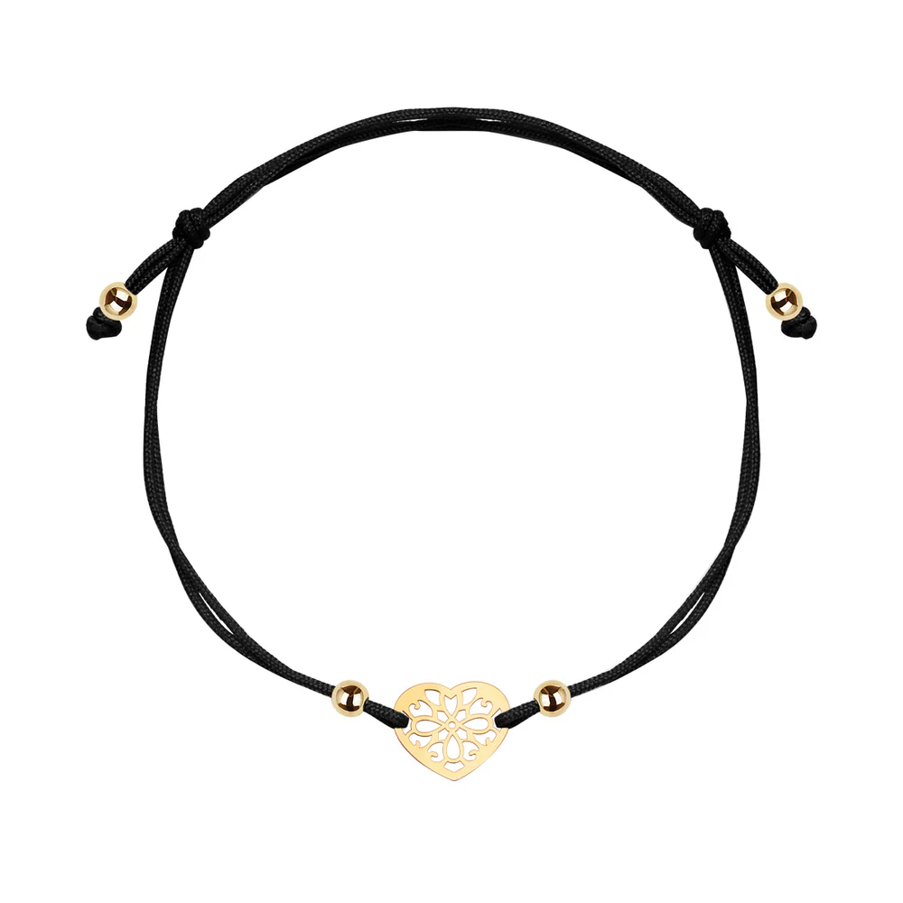 Bransoletka na czarnym sznurku wykonana ze złota próby 333. Ozdobiona ażurowym elementem w kształcie serca i drobnymi kulkami przy zapięciu. Subtelny model o symbolicznym charakterze, idealny jako biżuteria przyjaźni lub drobny prezent.