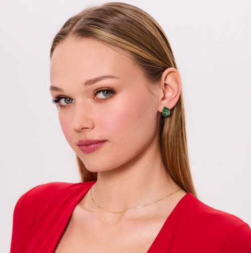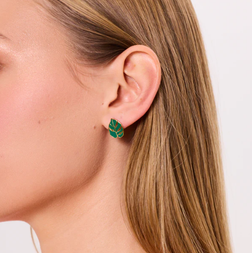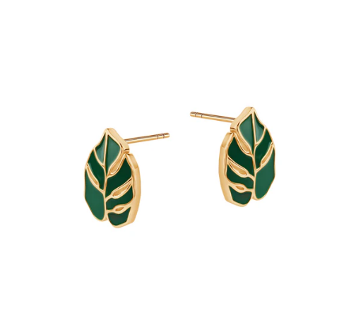 Kolczyki ze srebra pozłacanego próby 925 z motywem liści. Zielona emalia wypełnia kształt liścia z charakterystycznymi wycięciami, tworząc wyrazisty, roślinny akcent. Nieregularna linia konturu i kontrast między złoceniem a kolorem dodają całości nowoczesnego charakteru.
