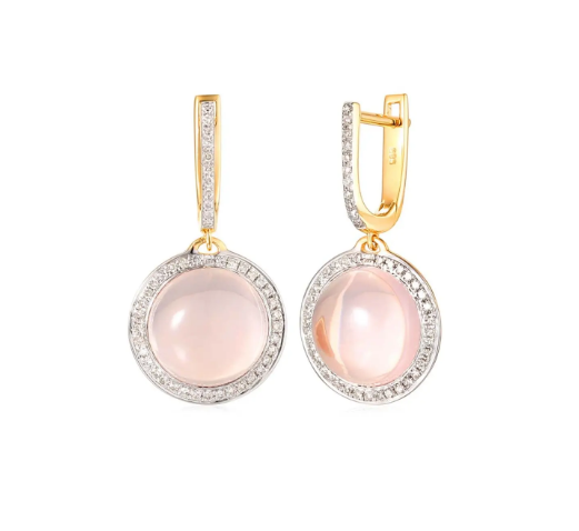 Złote kolczyki wiszące z diamentami i różowymi kwarcami to biżuteria na specjalne okazje, ale nie tylko. Kolczyki zdobią 2 różowe kwarce o łącznej masie około 9,52 karata oraz 92 diamenty liczące 0,31 karata. Świetlista aureola pięknie akcentuje róż kwarców, wydobywa ich naturalną urodę.