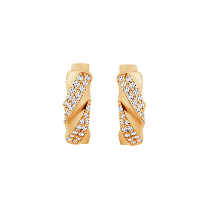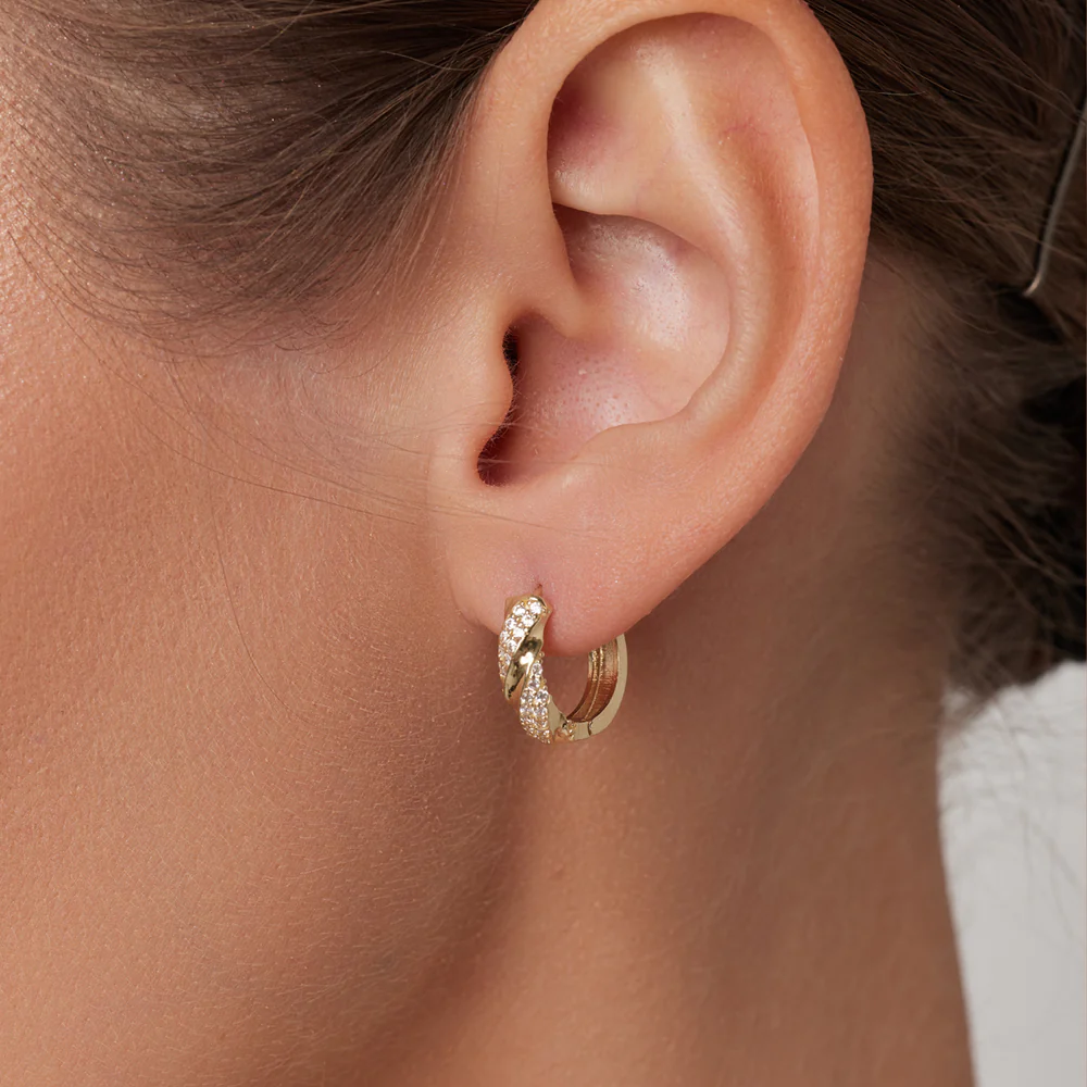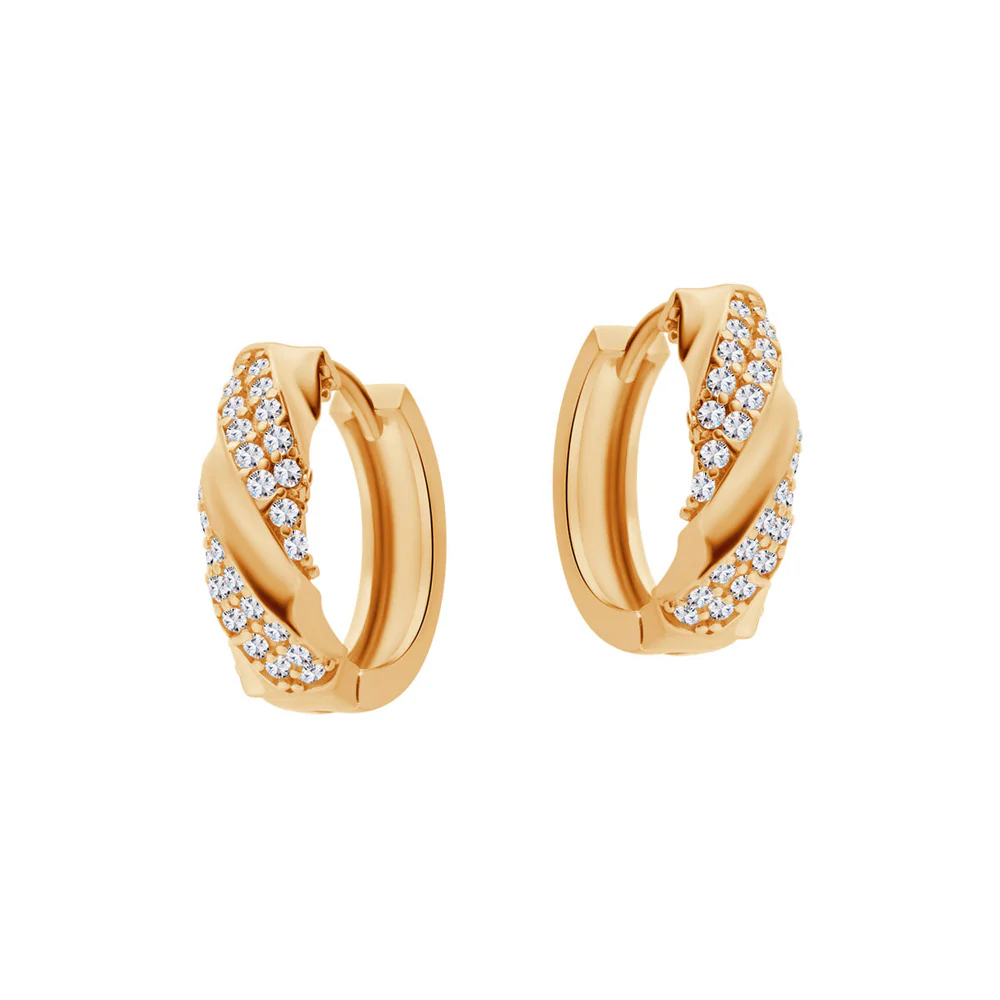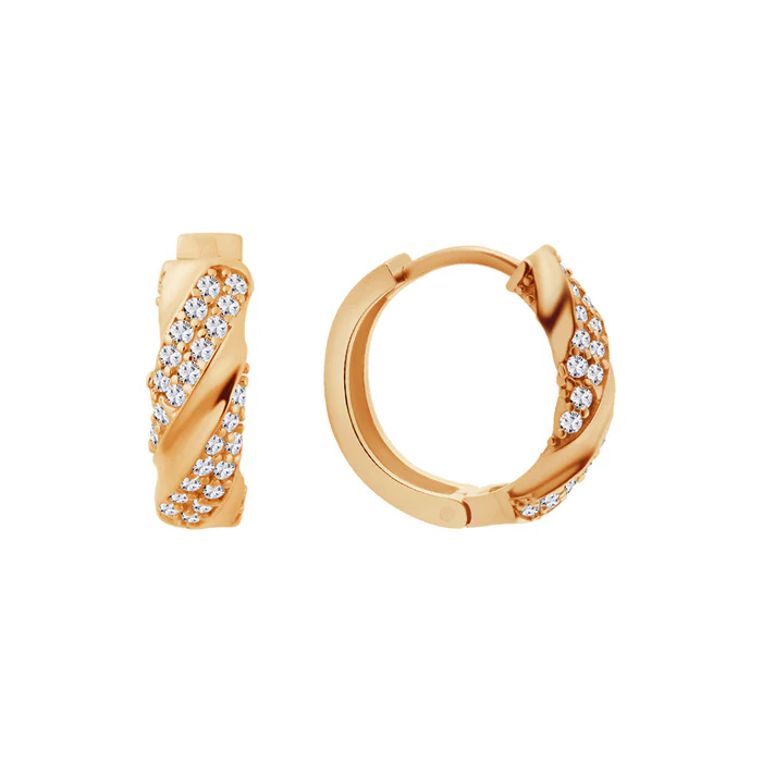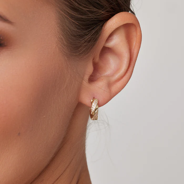 Kolczyki koła, wykonane ze złota próby 333. Model z przeplatanym wzorem na którym umieszczono cyrkonie.