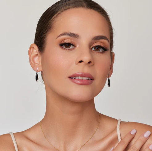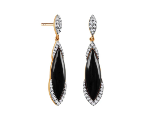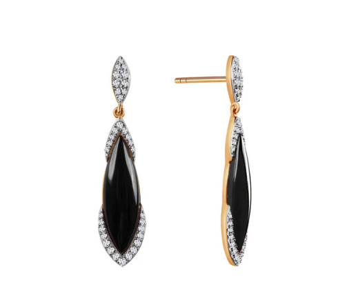 Kolczyki wiszące wykonane ze złota próby 585. Model ozdobiono czarnym onyksem umieszczonym w centralnym punkcie kolczyka, który otoczony został przez diamenty o szlifie ósemkowym. Zapięcie na sztyft.