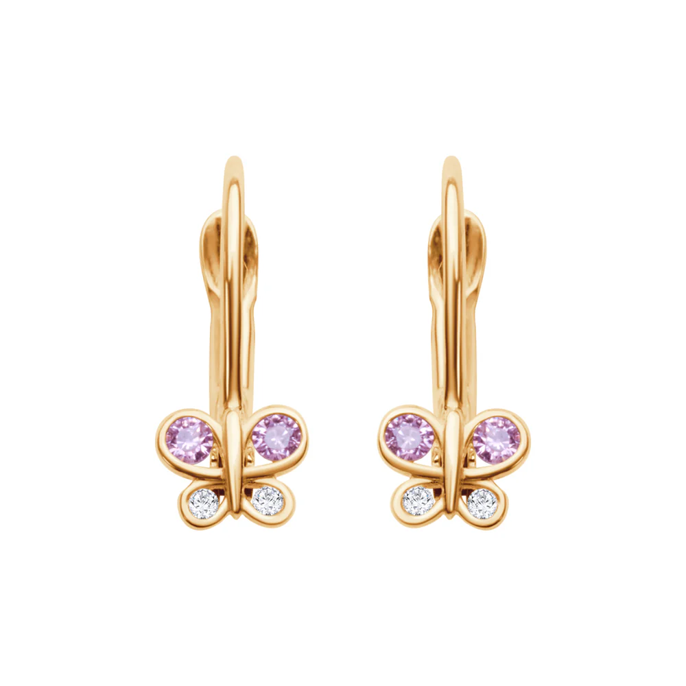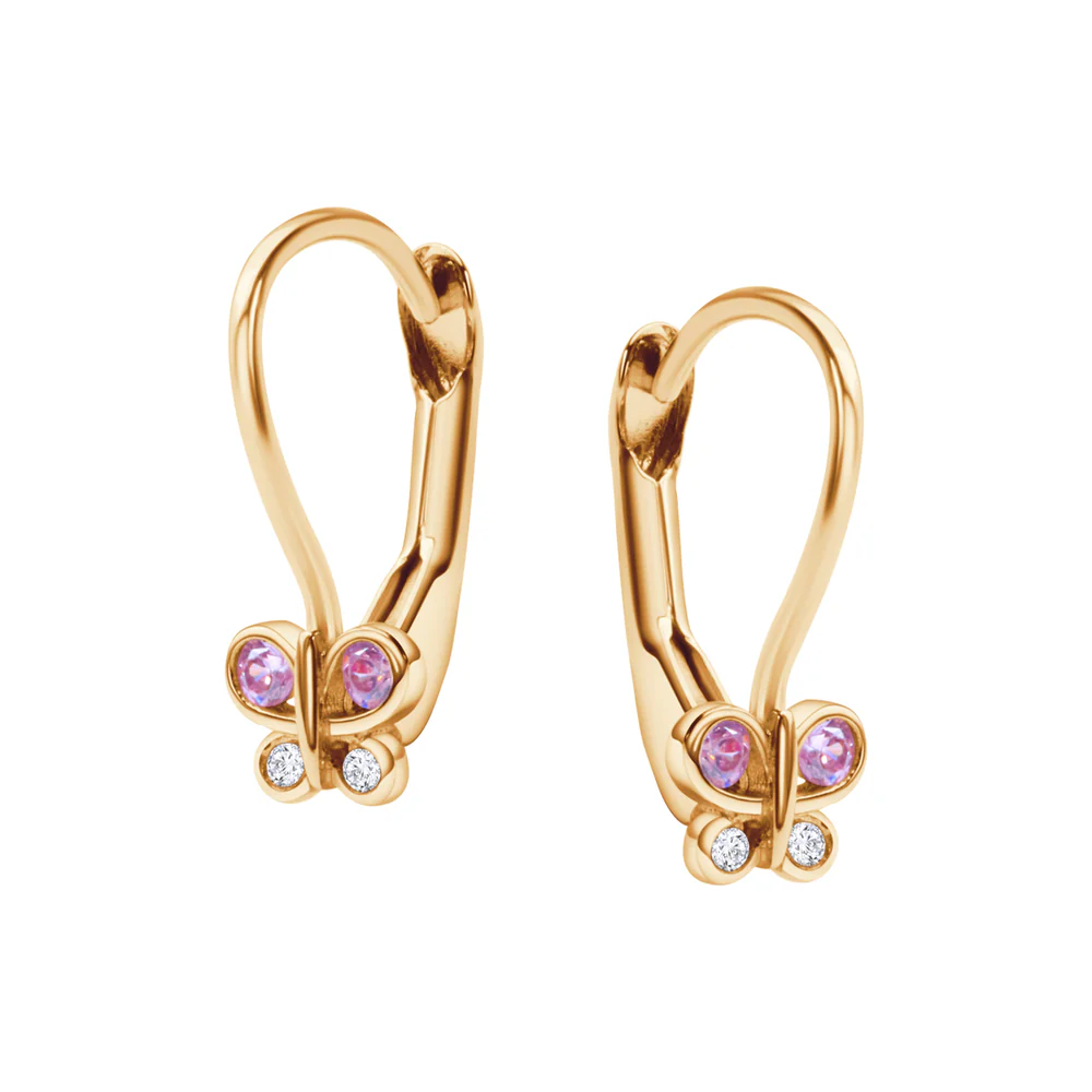 Kolczyki z żółtego złota próby 333 z motywem motyli. Skrzydełka ozdobiono różowymi i bezbarwnymi cyrkoniami. Biżuteria podkreśli subtelne, letnie stylizacje.