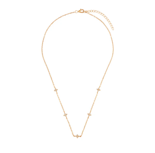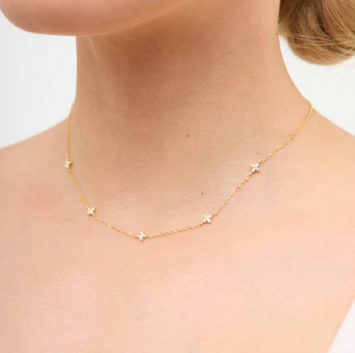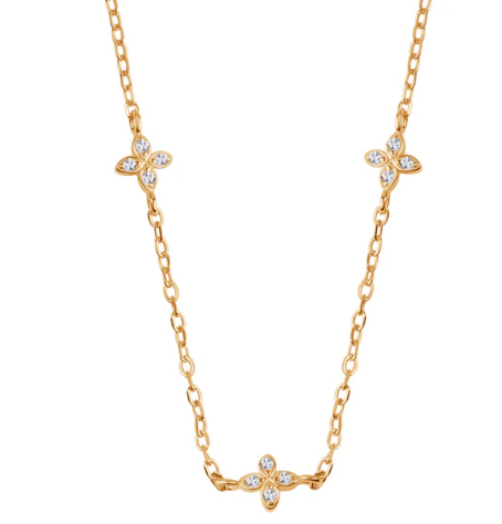 Naszyjnik z pozłacanego srebra próby 925, ozdobiony bezbarwnymi cyrkoniami w delikatnym kwiatowym wzorze. Subtelny i elegancki dodatek, który doskonale uzupełni każdą stylizację.