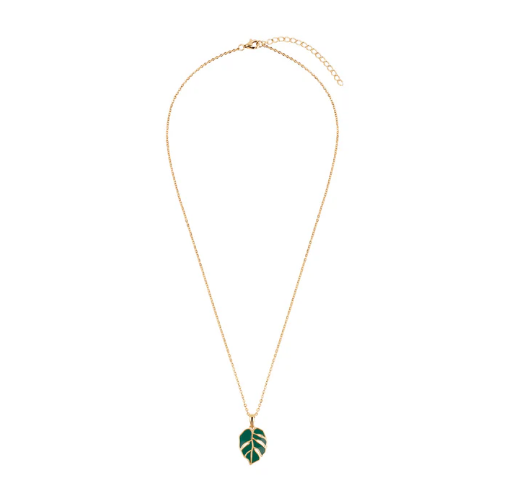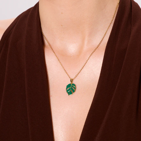 Naszyjnik z pozłacanego srebra próby 925 z zawieszką w kształcie liścia monstery. Motyw roślinny został wypełniony zieloną emalią, która podkreśla naturalny charakter biżuterii i nadaje jej wyrazistego akcentu. Delikatny łańcuszek i dekoracyjna zawieszka tworzą nowoczesną, a jednocześnie lekką kompozycję.