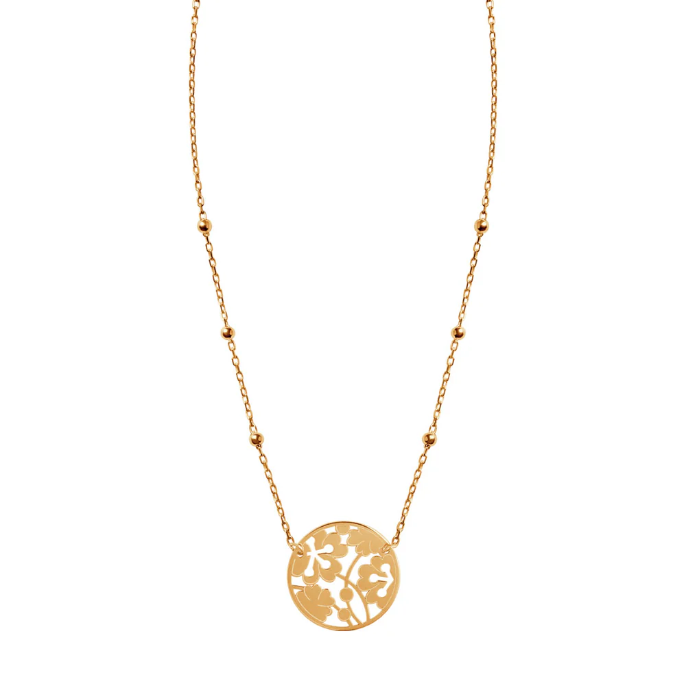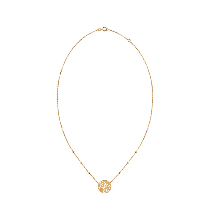 Subtelny naszyjnik wykonany ze złota próby 333. Model na długości łańcuszka został ozdobiony gładkimi kuleczkami. Ażurowe koło jest wykonane z motywem kwiatowym.