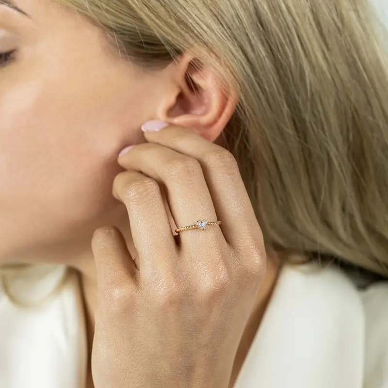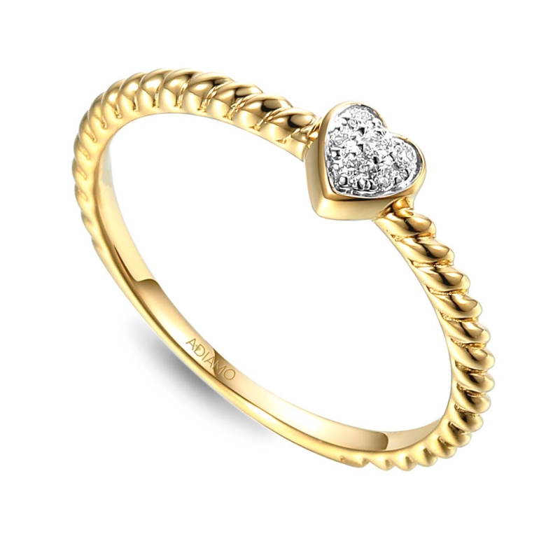 Pierścionek serce z diamentami wykonany jest z żółtego złota próby 585.