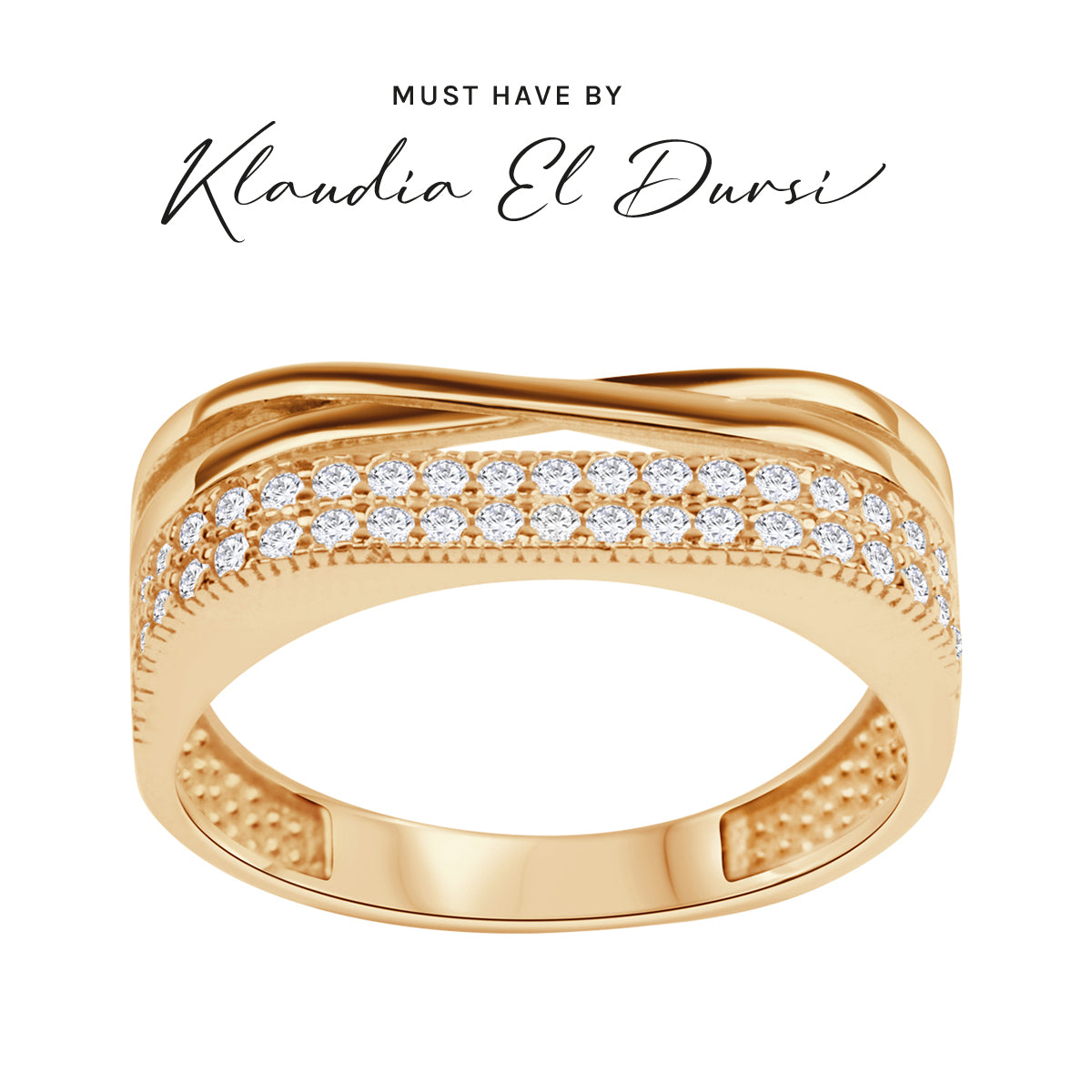 Szeroki pierścionek wykonany ze srebra w wykończeniu złoconym. Model do połowy ozdobiony lśniącymi cyrkoniami. Biżuteria dodatkowo składa się z dwóch cienkich obrączek, które krzyżują się ze sobą, tworząc unikalny wzór.