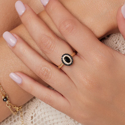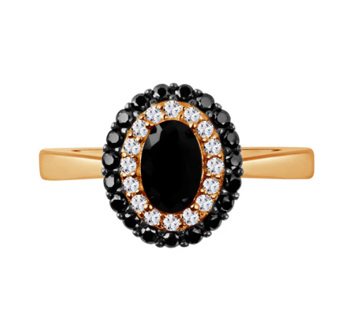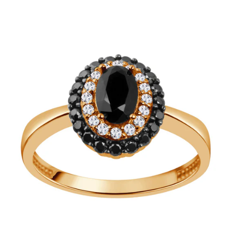 Pierścionek srebrny, pozłacany. Model posiada w centralnym miejscu owalną cyrkonię, wokół niej znajdują się bezbarwne oraz czarne cyrkonie. Biżuteria idealnie sprawdzi się w codziennych stylizacjach.