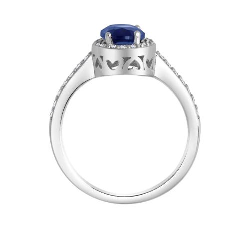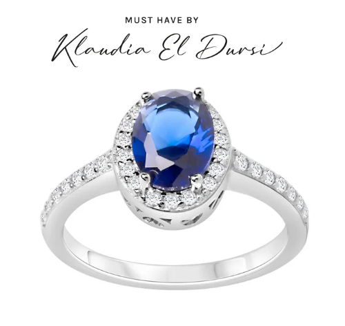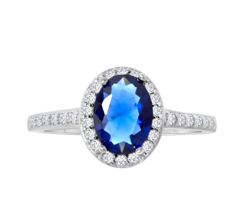 Pierścionek srebrny próby 925, rodowany. Model ozdobiony w centralnym miejscu niebieską cyrkonią w owalnym kształcie. Wokół niebieskiej cyrkonii oraz na szynie pierścionek został ozdobiony bezbarwnymi cyrkoniami.