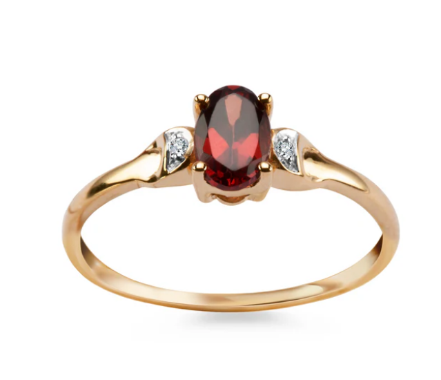 Model ozdobiono 2 diamentami o łącznej masie 0,01ct w jakości I/P2+, oraz granatem o masie 0,56ct.