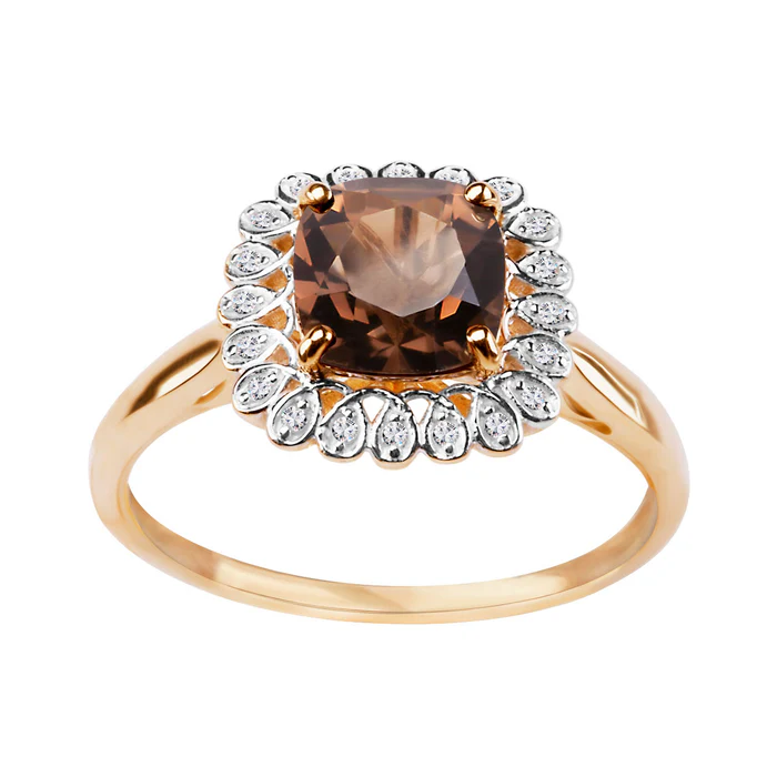 Model ozdobiono kwarcem dymnym o masie 1,30ct oraz 20 diamentami o łącznej masie 0,056ct (H/SI-I1).