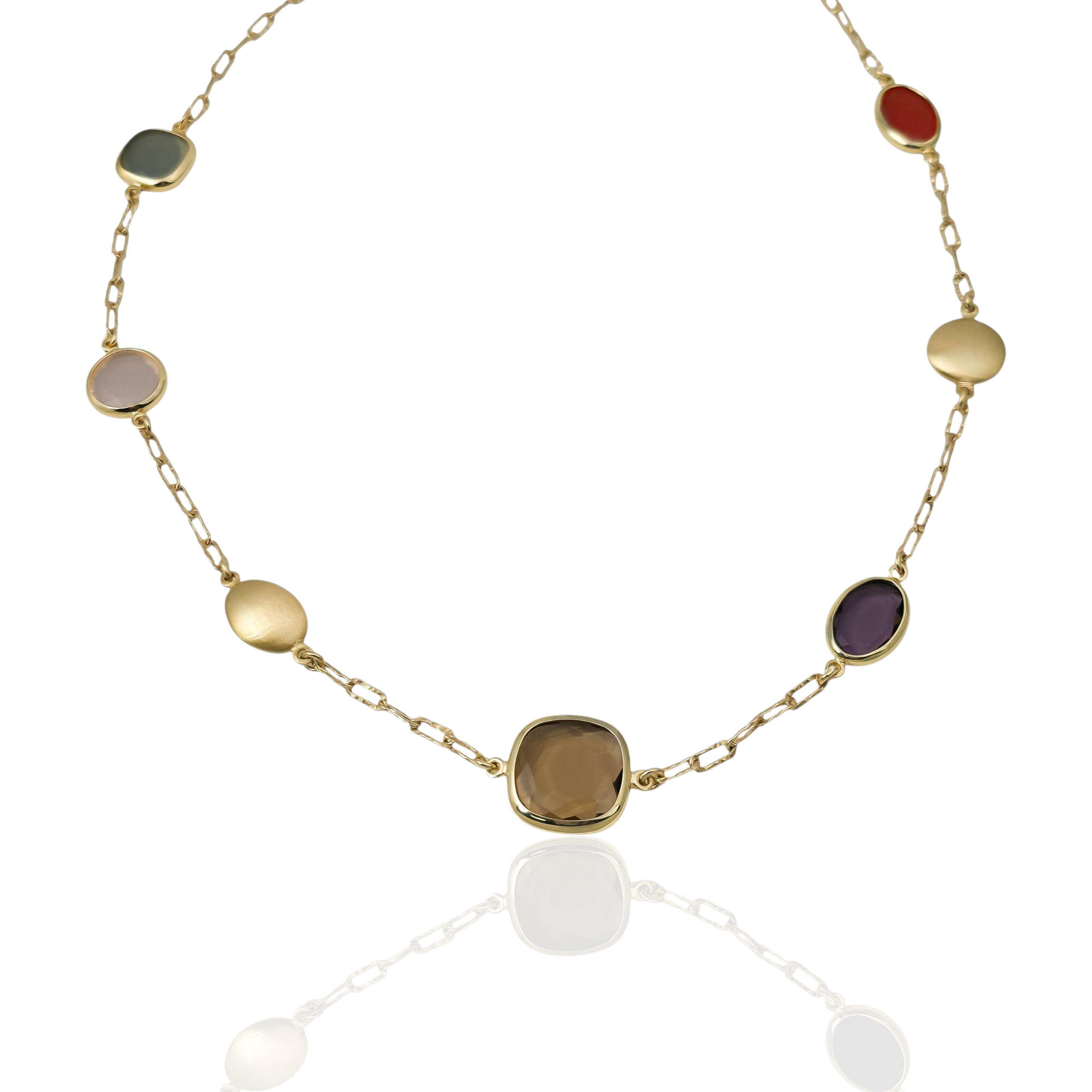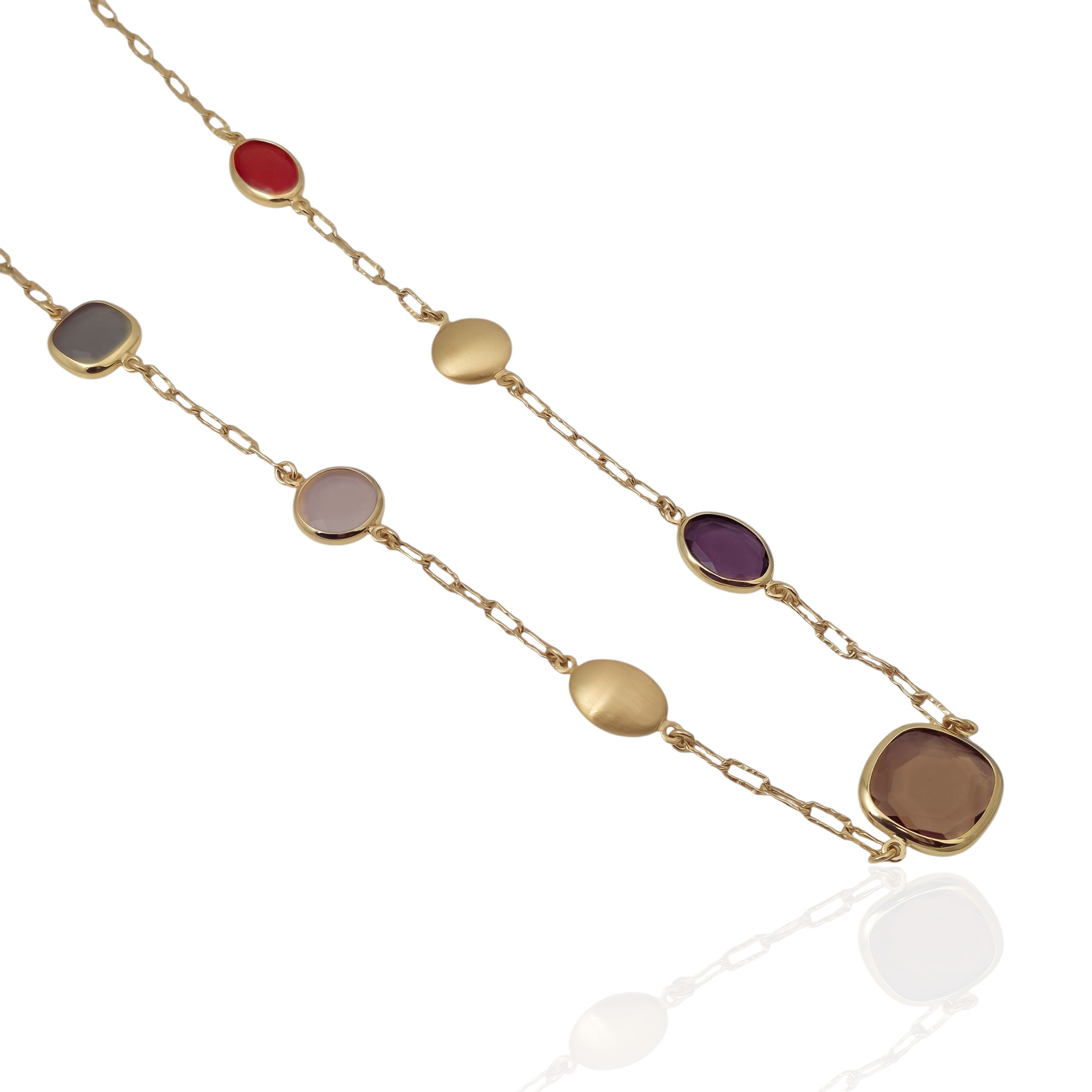 Kolia z kolekcji SUBLIME LUMI z fasetowanymi kolorowymi kamieniami szklanymi. Wykonana ze srebra próby 925 pokrytego dodatkową warstwą 23ct złota metodą elektroforetyczną. Połączenie kamieni w odcieniach beży i elementów satynowanych. Dł. 40-45cm. Nowatorska technika złocenia zwiększa odporność na zarysowania i przedłuża trwałość produktu. Produkt wyprodukowany we Włoszech