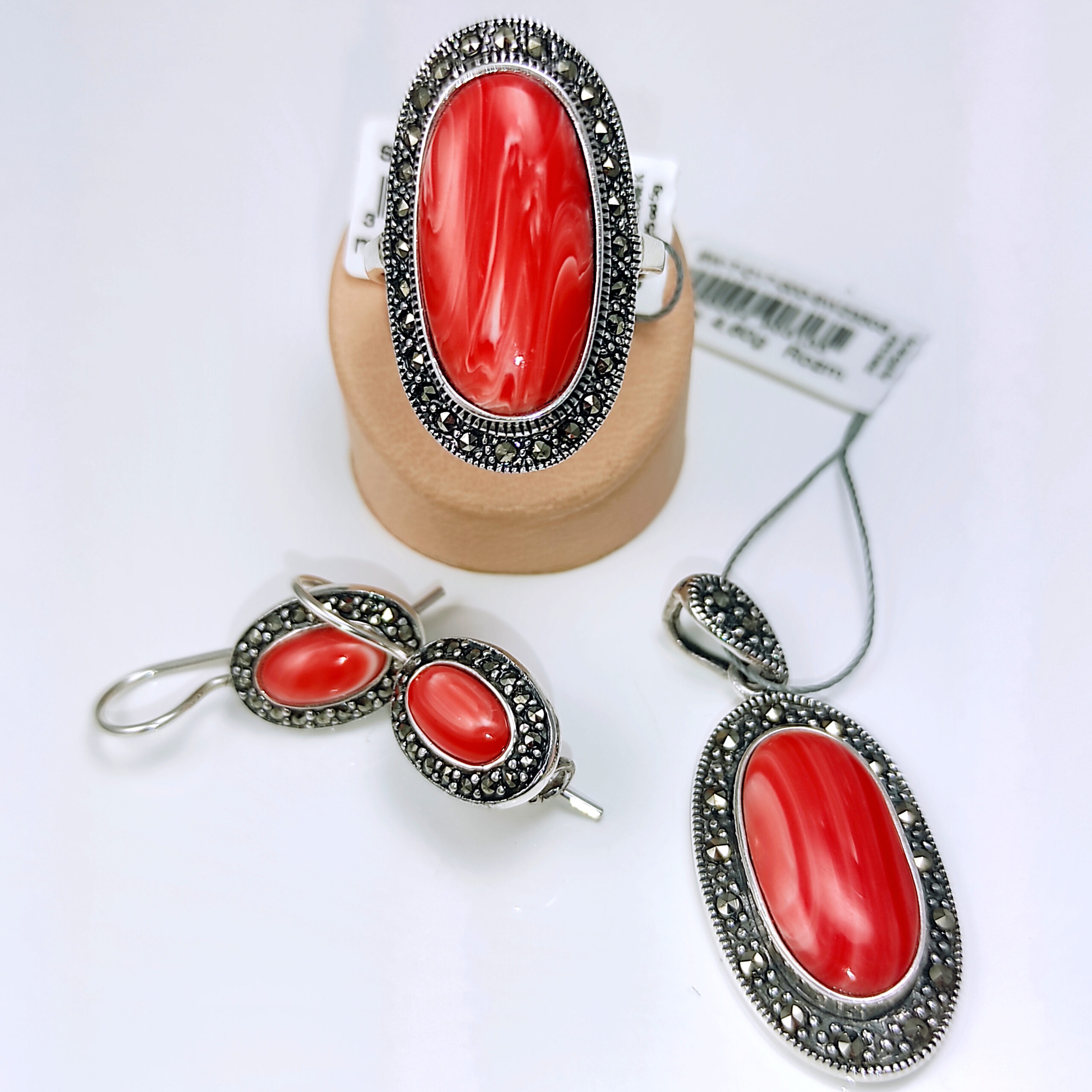 Zawieszka ozdobiona markazytami i koralem, wykonana ze srebra próby 0,925.