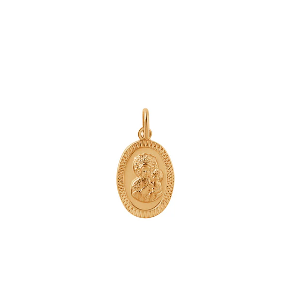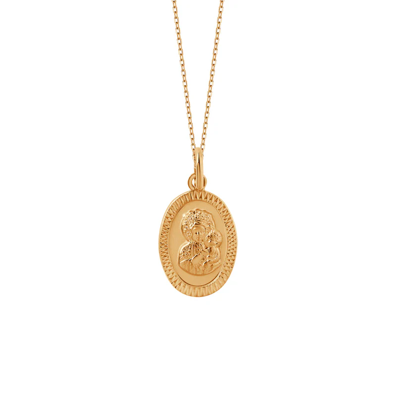 Medalik w owalnym kształcie wykonany ze złota próby 333. Model ozdobiono wizerunkiem Matki Boskiej. Idealny prezent na komunie.