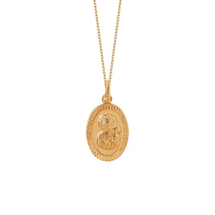 Medalik w owalnym kształcie wykonany ze złota próby 333. Model ozdobiono wizerunkiem Matki Boskiej. Idealny prezent na komunie.