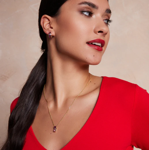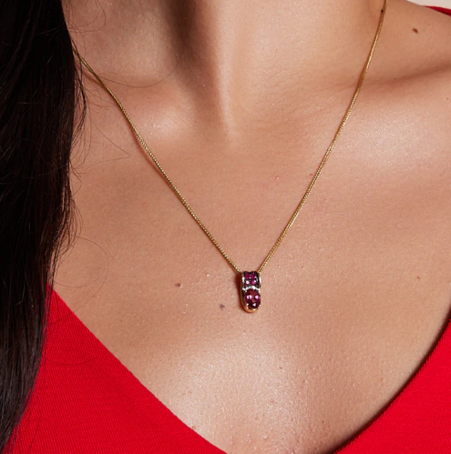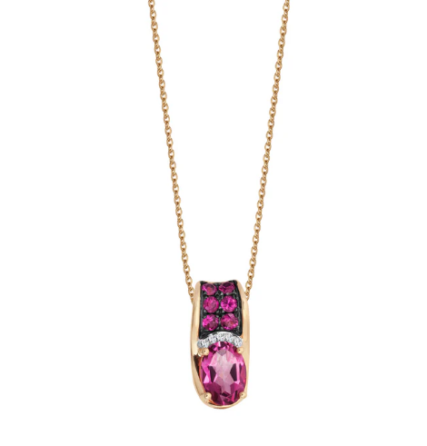 Model ozdobiono 5 diamentami o łącznej masie 0,015ct (H-I/I1-I2), topazem różowym o łącznej masie 0,89ct i 6 rubinami o łącznej masie 0,19ct.