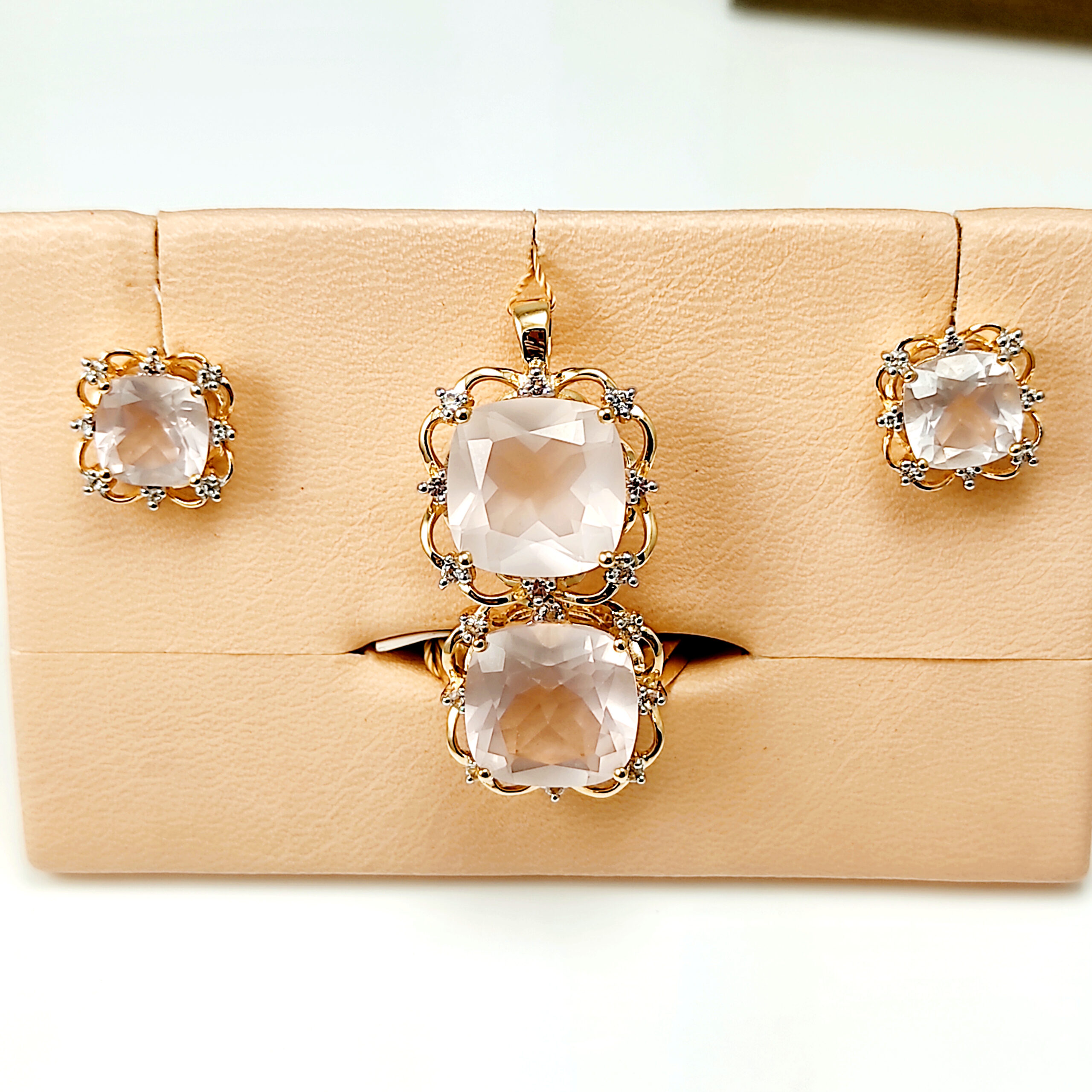 Model ozdobiono kwarcem różowym o masie 5 ct oraz 8 topazami, o łącznej masie 0,13 ct.