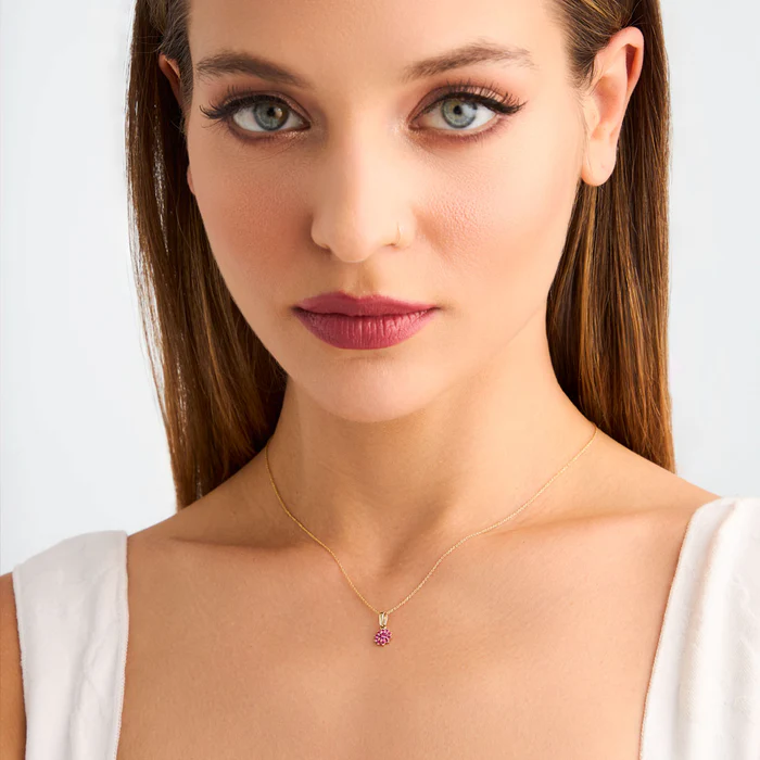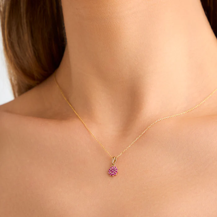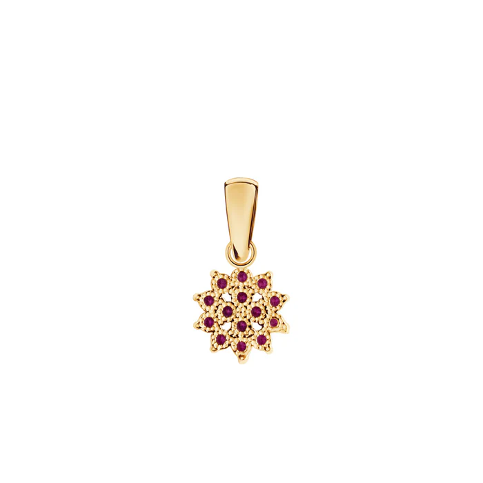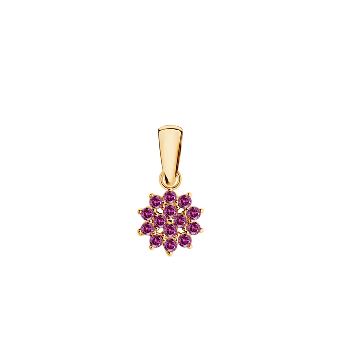 Zawieszka wykonana z żółtego złota próby 333. Motyw kwiatowy uformowany z różowych cyrkonii osadzonych w regularnym układzie. Złocisty uchwyt umożliwia zawieszenie na cienkim łańcuszku. Model w klasycznym stylu o romantycznym wyrazie.
