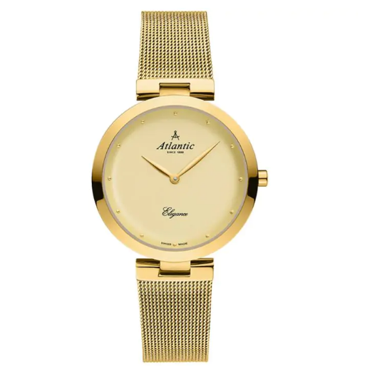Atlantic Elegance 29036.45.31MB to damski zegarek biżuteryjny, który łączy klasyczną formę z nietuzinkowym kolorem tarczy. Ciepły, żółty cyferblat przyciąga wzrok, podkreślając indywidualny styl.